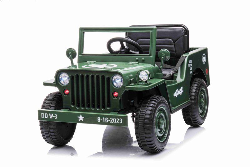 Prachtige jeep die in ieders geheugen gegrift staat als het icoon van de bevrijding in Europa. Deze mooie jeep heeft retro looks, maar is geheel bij de tijd qua opties. Uiteraard uitgerust met 4wd! Dus op elk wiel een dikke 40w motor. Leder look stoelen en achterin een bankje. Dit is een drie zitter met op elk zitje een gordel. Voorzien van een 2.4ghz softstart afstandsbediening en een heavy duty 12V10ah accu pack.Het oog wil ook wat dus super veel details zoals op een echte ’45 jeep. Tevens met kogellagers in de velgen, metalen bumper en rond om afgeveerd.