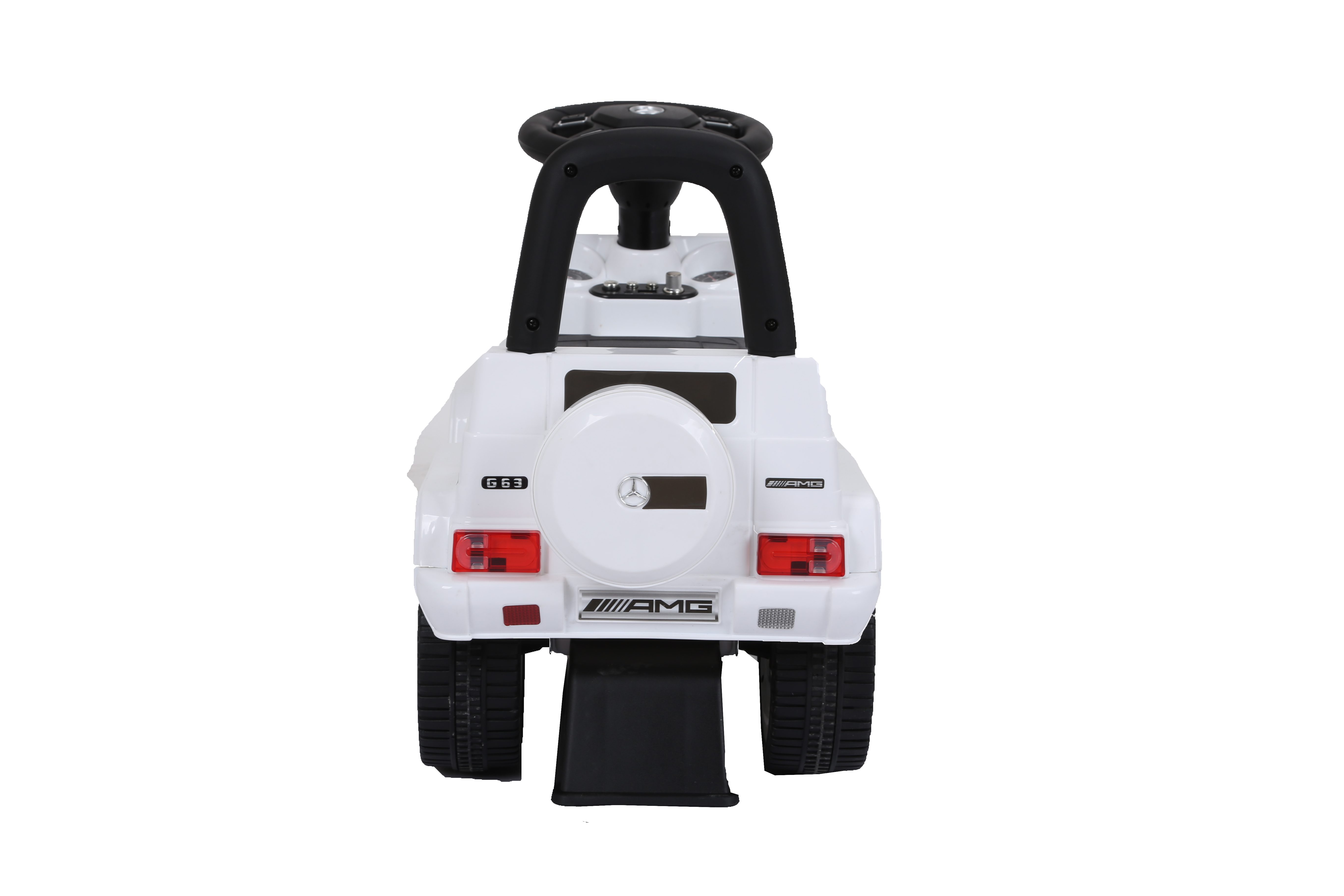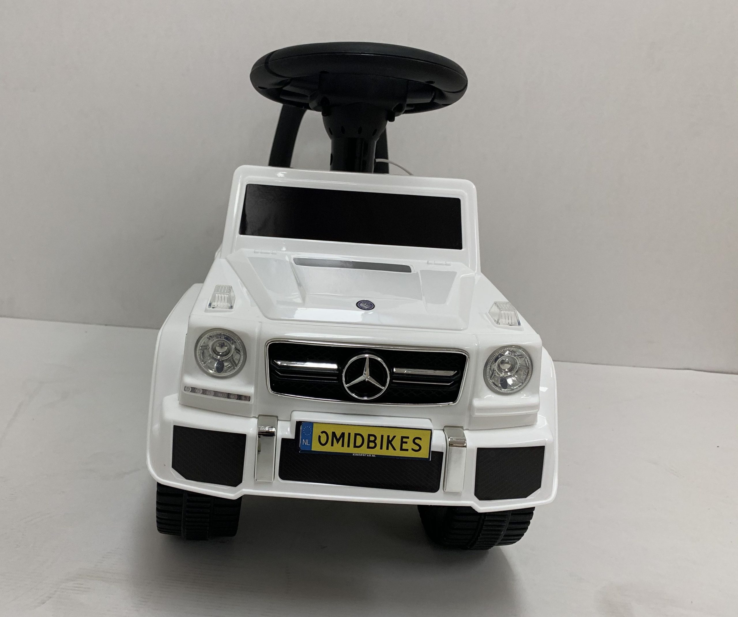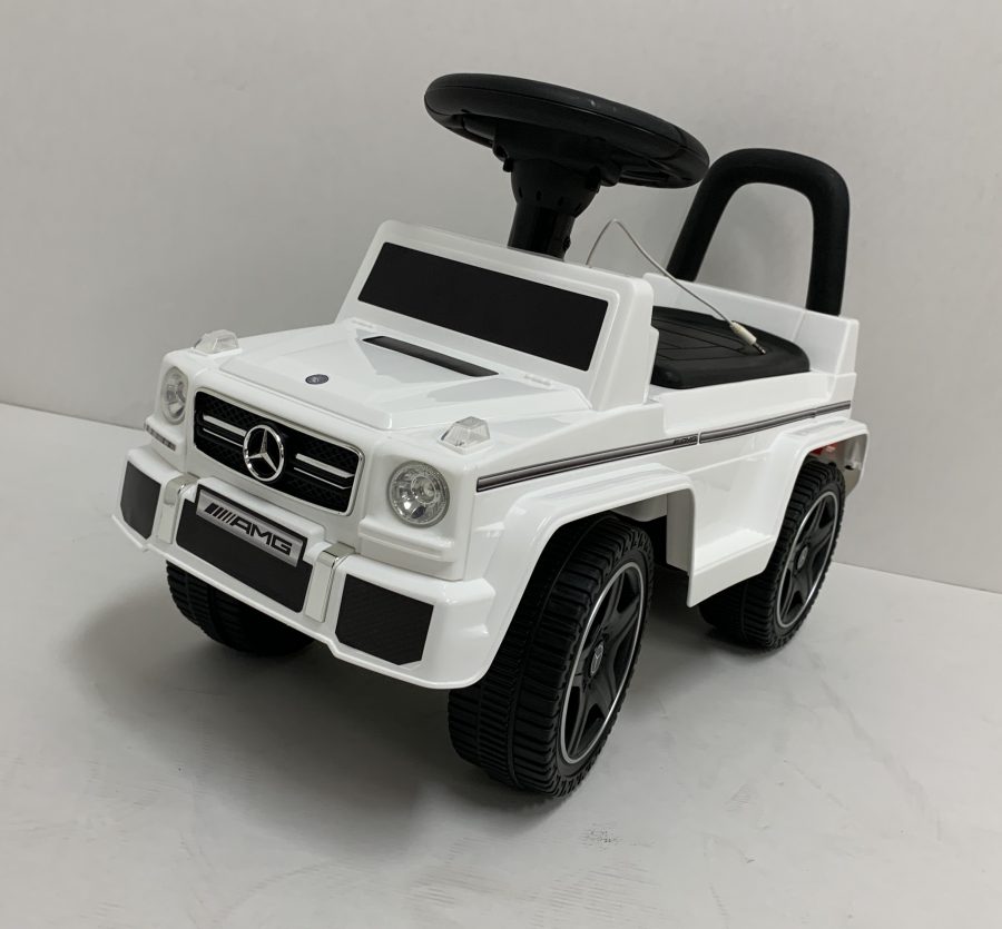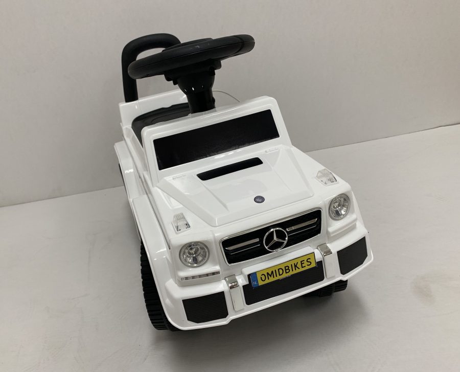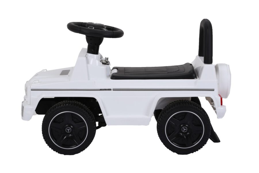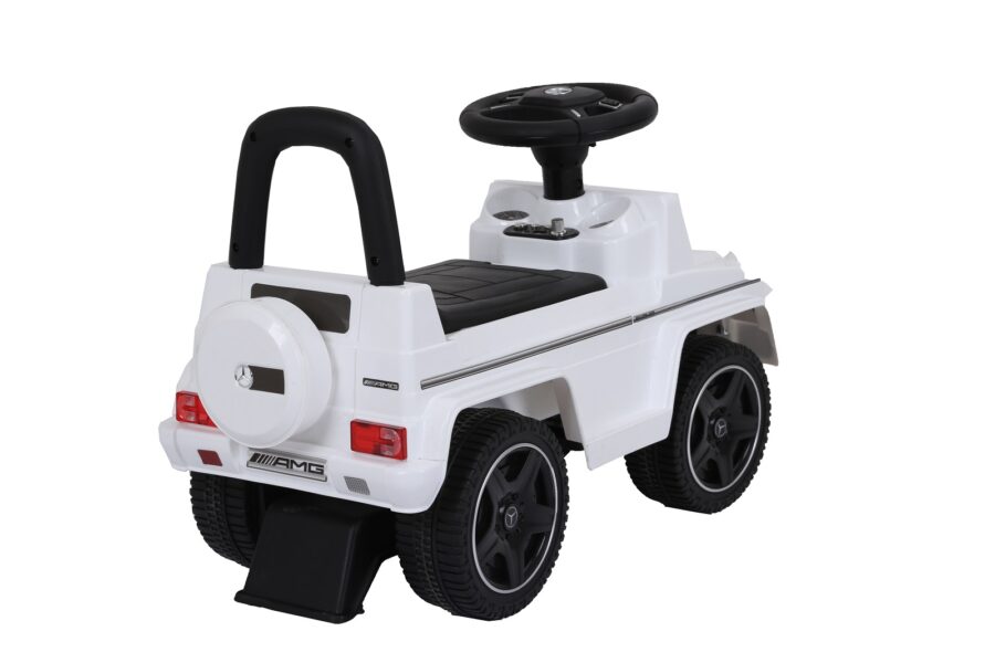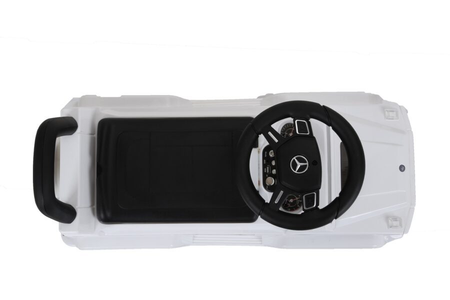 Deze luxe Mercedes G63 AMG loopauto is voorzien van een AUX / MP3 input en boxen om muziek rechtstreeks vanaf je telefoon en MP3 speler af te spellen!
