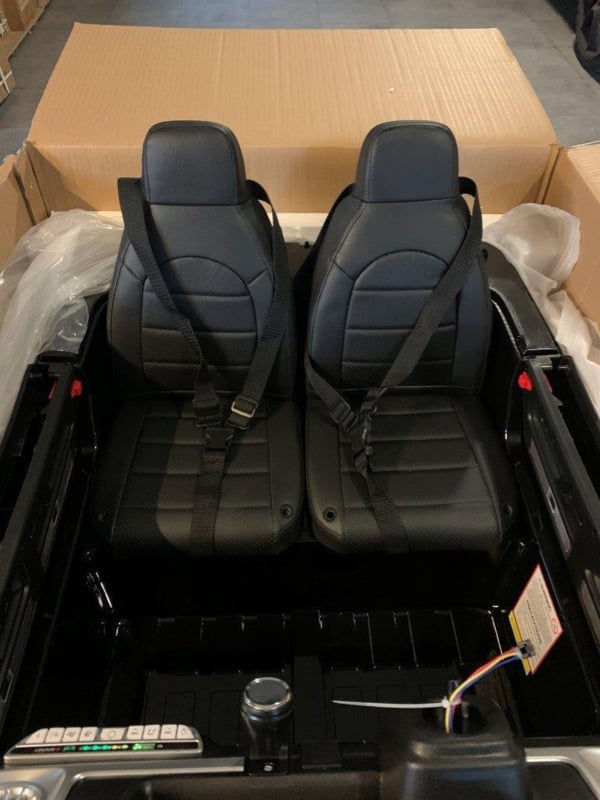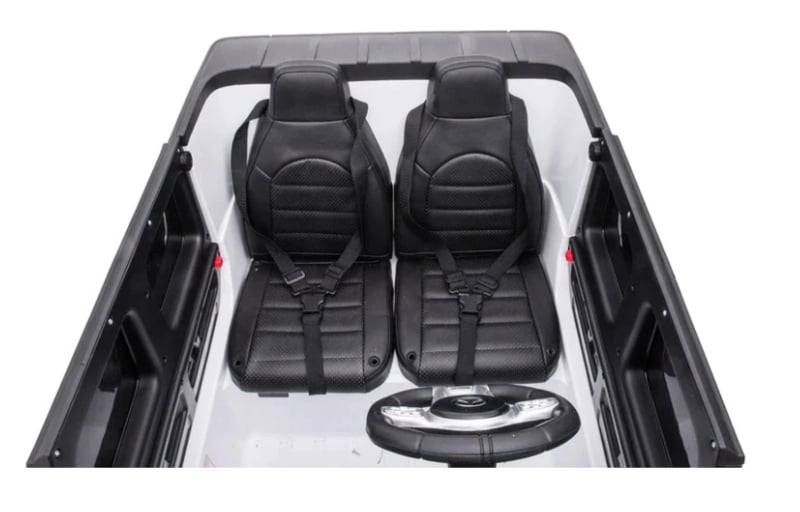 Met twee zitplaatsen en luxe leder-look stoelen is hij perfect voor broertjes, zusjes of speelvriendjes. De automatische remfunctie, driepuntsgordels en achtervering zorgen voor veiligheid en comfort tijdens elke rit. Besturing kan zowel via het gaspedaal als op afstand met de meegeleverde 2.4GHz afstandsbediening (met 3 snelheden).